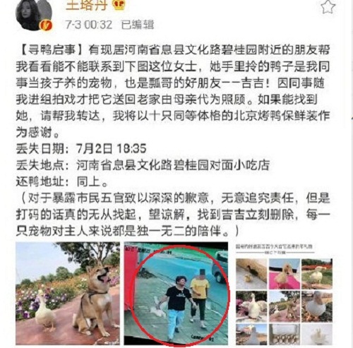 王珞丹在发文中也交代了这次事件的起因,因同事飘哥随自己进组拍戏,所以只能将自己的宠物鸭“吉吉”送回老家,由飘哥的母亲照顾,发生丢失事件后,王珞丹和飘哥也是十分着急,想找回“吉吉”,王珞丹也在微博上附上了监控照片,也承诺找到“吉吉”和删除照片。
