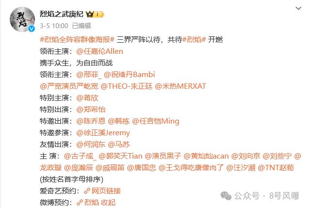 而剧方在官宣番位时用 " 携手众生,为自由而战 " 的文案直接将任嘉伦和其他演员隔开,给足了他一番大男主排面。而且配角阵容十分豪华,有蒋欣、郑希怡、陈乔恩、徐正溪、何润东这样的知名演员。