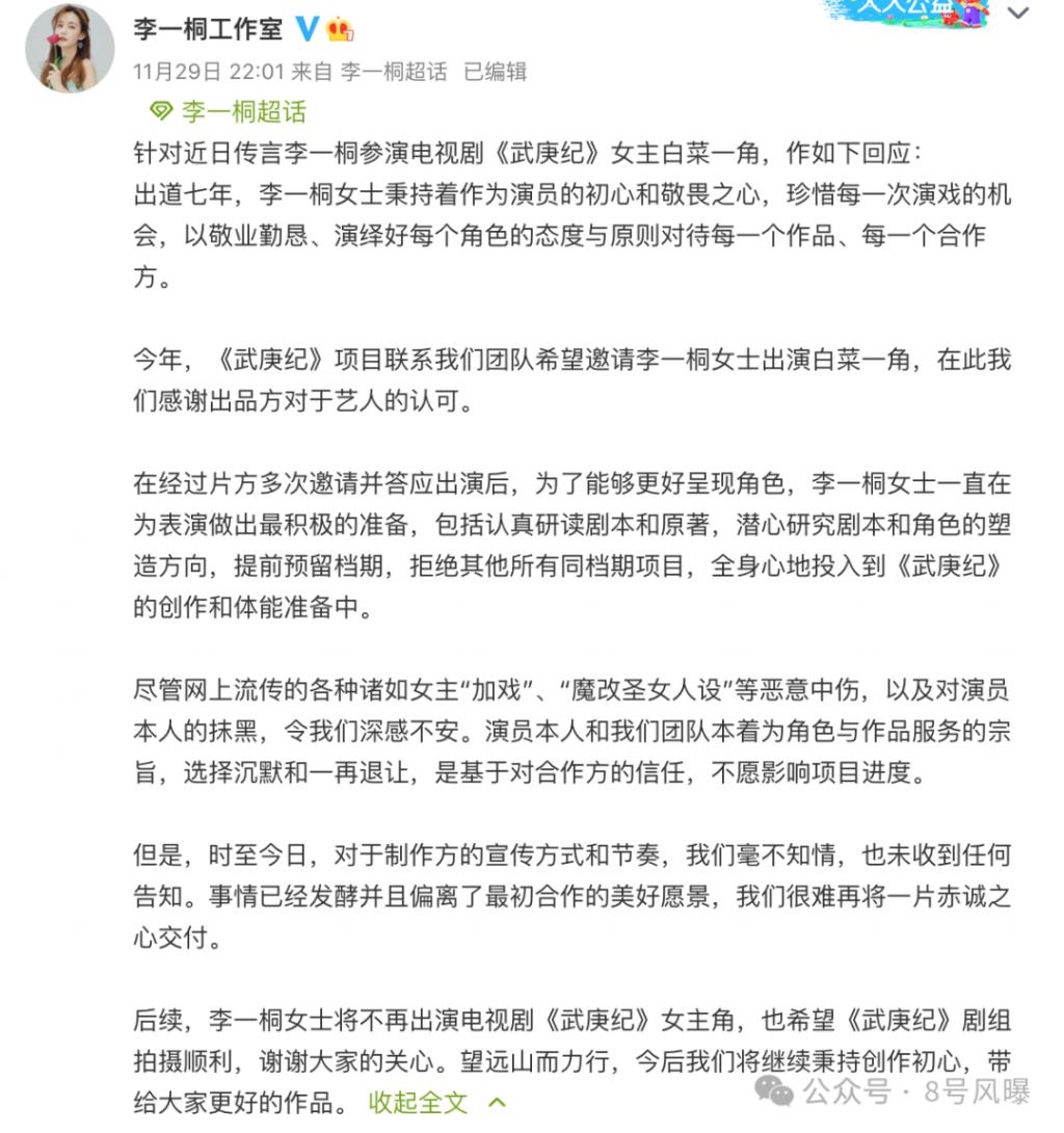 文中提到,李一桐已经为该剧留出档期,但对于制作方的宣传方式和节奏却毫不知情,且未收到任何告知,后续李一桐将不再出演该剧女主角。