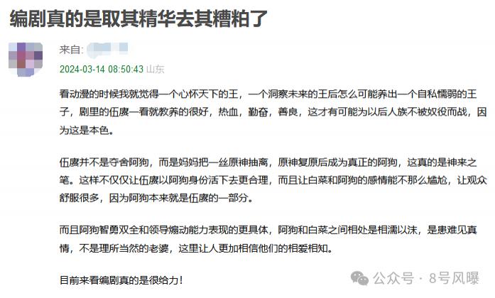 而在剧中,阿狗是伍赓母亲之前安排好的,伍赓通过原神复原变成了真正的阿狗,那么他的变化就显得正常,和白菜的感情线发展也有之前的相处作为铺垫。