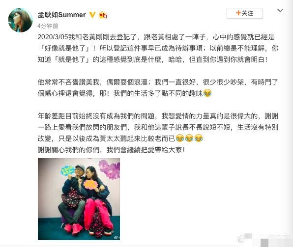 随后,孟耿如也发文称年龄差距目前始终没有成为我们的问题,爱情的力量真的是很伟大的,谢谢一路上爱着我们的朋友们,我和他这辈子说长不长说短不短,生活没有特别改变,只是以后成为黄太太听起来比较老而已。