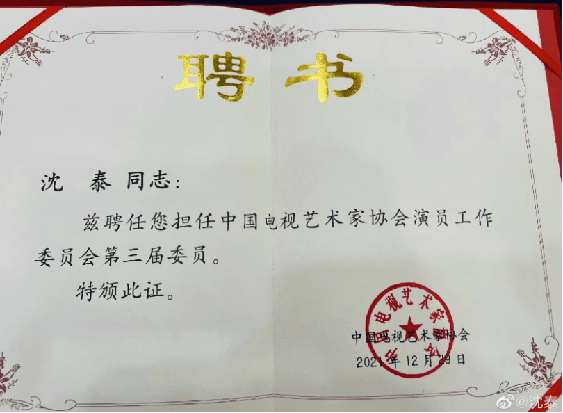 2025年12月29日,演员沈泰被聘任为“中国电视艺术家协会演员工作委员会”(简称“中国视协演员工作委员会”)委员。中国电视艺术家协会(简称中国视协)成立于1985年,是中国共产党领导的、全国各民族电视艺术家组成的专业性人民团体。中国电视艺术家协会是中国文学艺术界联合会的团体会员。