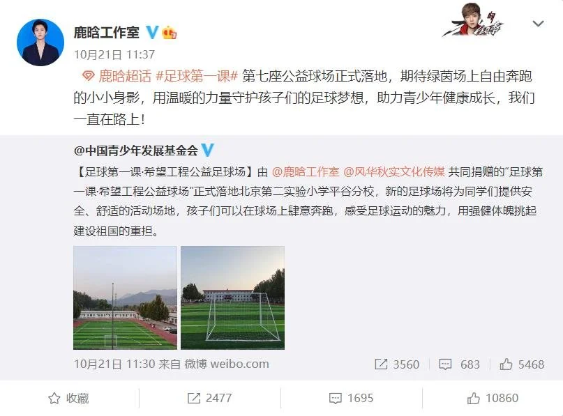 据悉,这已经是鹿晗促成的第七座公益球场,工作室表示公益一直在路上。