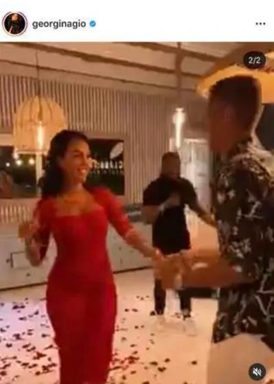 随后乔治娜上传了一段两人在玫瑰花瓣中共舞的视频,两人满脸微笑,乔治娜穿着一身紧身红色礼服,勾勒出性感的S型曲线,和帅气的C罗在一起十分登对。