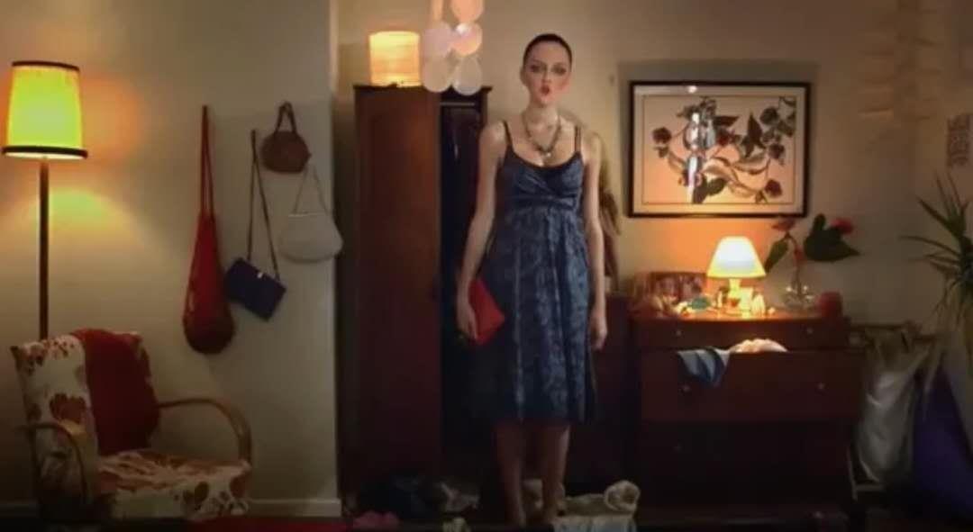 女主为去和男友约会,把自己衣柜的衣服都拿出来,一件件的试着……很不幸,连衣裙费了九牛二虎之力,仍然没有穿进去,牛仔裤勉强穿进去了,但也把裤撑破了。
