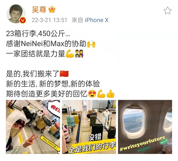 2022年3月22日,吴尊拖家带口,带着23箱重达450公斤的行李,将自己的家搬到了中国。