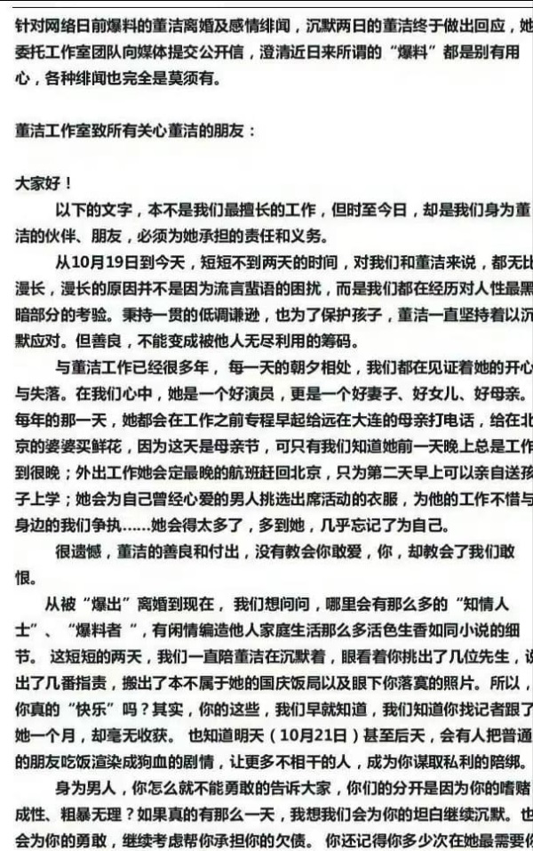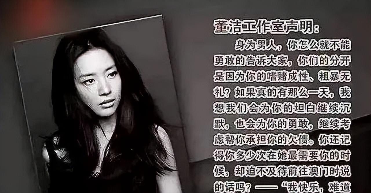 其实早在2012年10月,董洁的工作室就发文称董洁已经和潘粤明离婚了,并长篇大论谴责潘粤明在婚内的不负责行为,还赌博酗酒,给大家呈现出了一个柔弱女子的卑微形象。