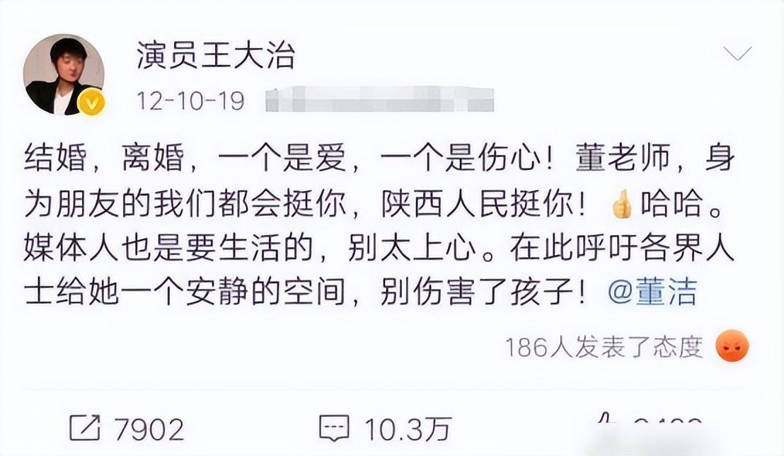 为此,王大治的微博账号已经十几年没有更新了,最近的一次还是他在董洁离婚的时候,发了一篇力挺董洁的文章,而直到今天,还是有人在他的微博评论下发出新鲜的咒骂。