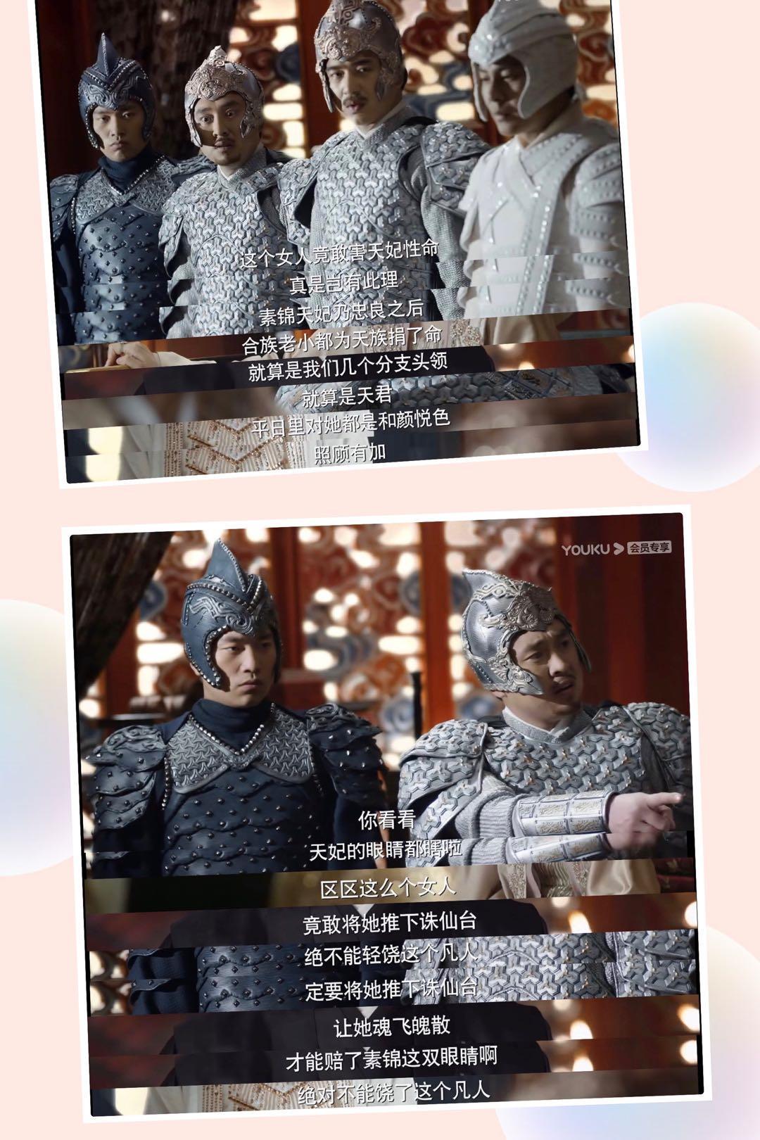 在夜华平乱凯旋时,众人所知,素素在诛仙台伤了素锦眼睛——这当然是素锦阴谋算计的结果,同时天君事先把素锦娘家人的各位头领故意纠集在一起,各位头领对自己的功臣之后遭受如此对待义愤填膺,决心把这个凡人扔下诛仙台。