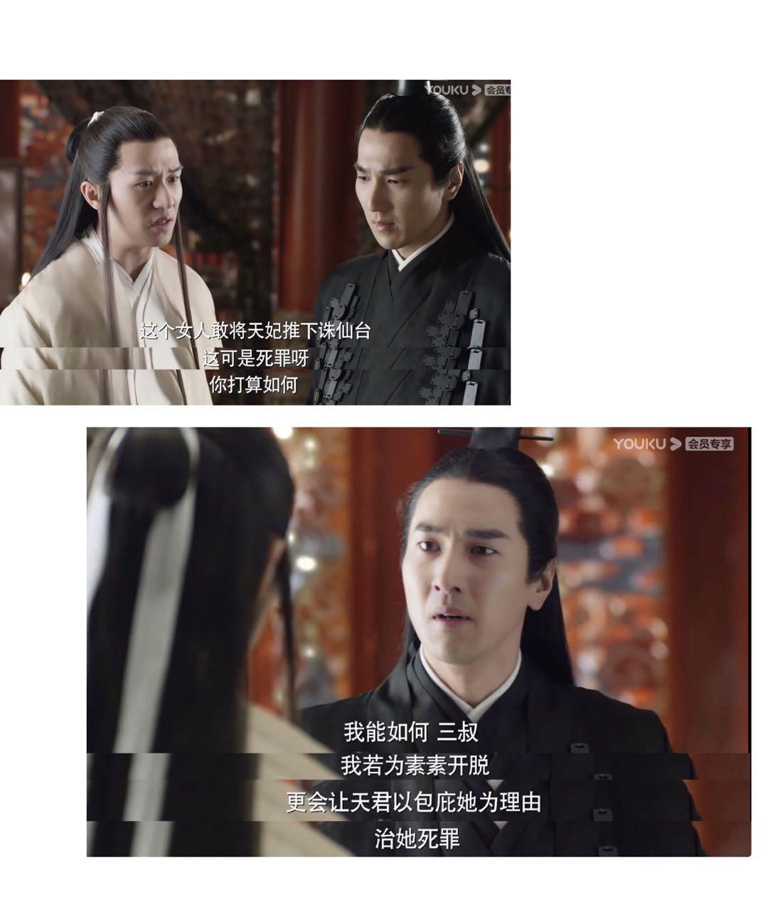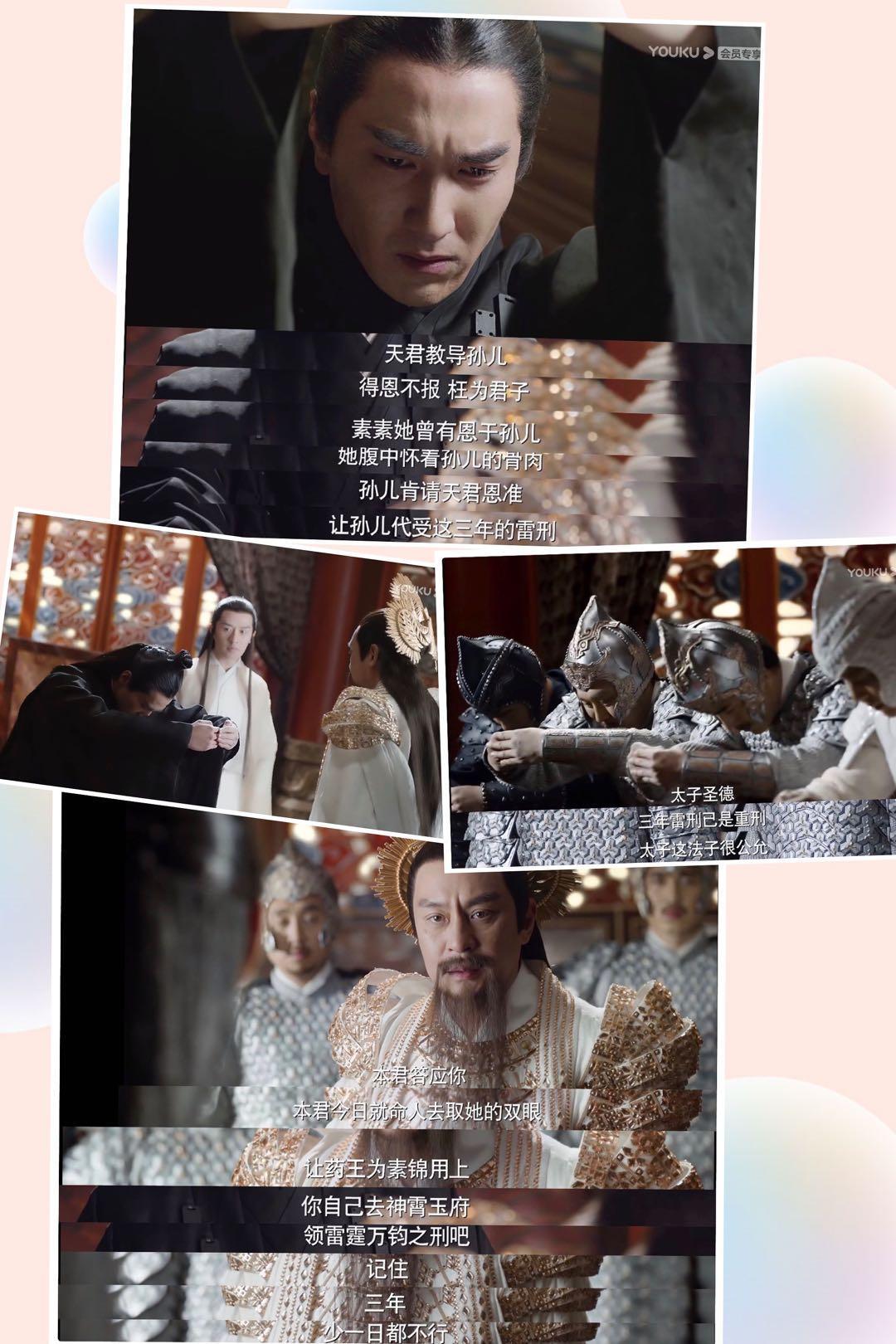 意识到问题的严重性,只好退而求其次,为保素素的性命,提出把素素的眼睛赔给素锦,并执行雷刑3年整,此时被天君故意纠集在一起的素锦族各头领,看到如此情况,认为太子能顾全大局,提出的这个惩罚已经比较重,也不好再坚持处死素素,毕竟是太子的女人嘛,且身怀有孕,只好表示同意,此时天君也只能顺水推舟。