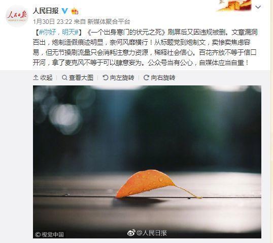 1月30日上午消息,一篇公众号文章《一个出身寒门的状元之死》成为朋友圈刷屏文章,但是很快,该文被质疑是“造假杜撰”,引发圈内人士讨伐。
