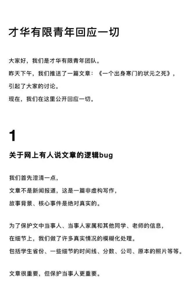 网络上舆情四起,前一秒网民们还在感叹《一个出身寒门的状元之死》文中的寒门状元努力谋生、坚持原则却无法成功的悲剧。下一秒质疑声便接踵而来,好奇的网民们发现文章内容模糊的时间、地点……以及细节之中的种种矛盾,还有发布账号所属为影视传媒公司身份的特殊性,让文章的真实性生出一个大大的问号,这位出身寒门的状元之“死”,成了2020年伊始网络上最大的一幕罗生门。