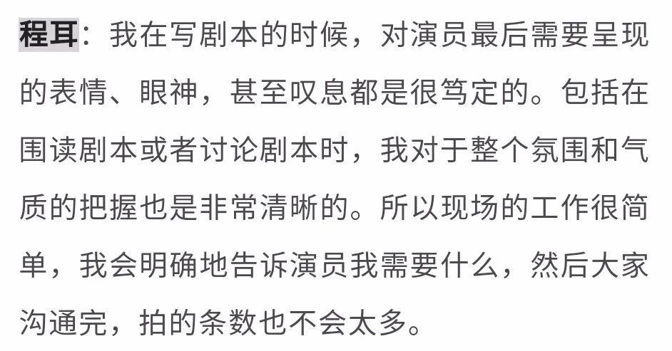 说白了,程耳是写剧本时就明确每场戏需要什么眼神什么表情的那种导演,演员想跑太偏也难。