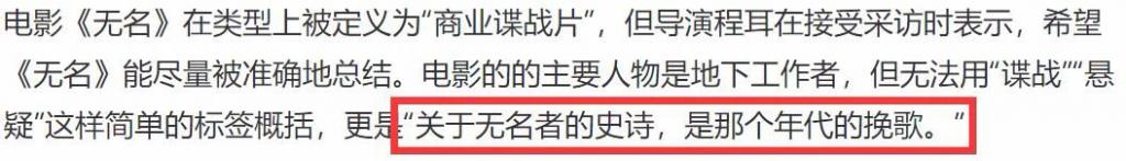 而说回《无名》,用导演自己的话讲,高能反转、刺激谍战等标签固然吸睛,却都不如介绍它为"关于无名者的史诗,那个年代的挽歌"来得准确。