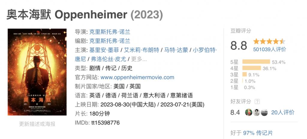 这一群人成为了最初的小雪球,让这部片的讨论滚动了起来,用充足且正确的预期辐射到了不少原本并非该片受众,甚至预期有错的人,数据上的结果就是《奥本海默》上映后一度冲到了热搜第 1,票房从 2.8 亿预估,冲到了现在的 4.3 亿,豆瓣分没有像之前我们悲观预估的那样下降,反而从本身就已经算是高位的 8.6 继续加到了 8.8(一度上到 8.9),走了一个口碑票房双收的长线。