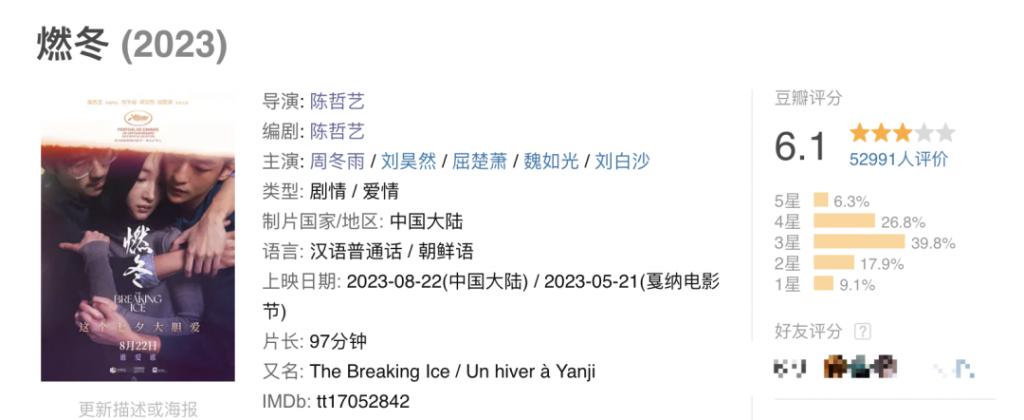 我是当时给了《燃冬》中上评价的人,用的词是 " 总体喜欢 ",微博发了一篇观看《燃冬》的合理预期和门槛,希望这部片能找准受众,宣发也不要再骗观众了。