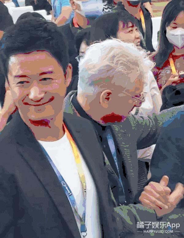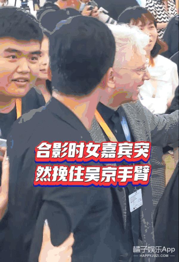 在合影环节,旁边的女嘉宾突然挽住他的手臂,吴京微笑着躲开了。