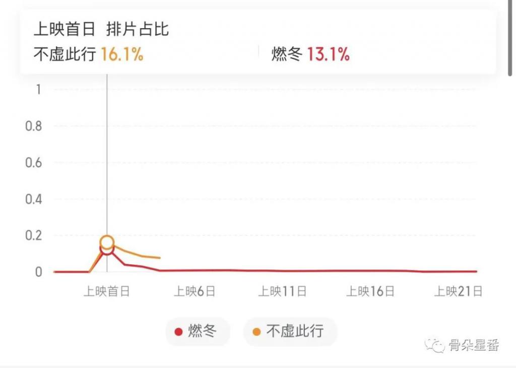 《燃冬》定档八月末,《不虚此行》定档九月初,避开了暑期档各类影片较量最为胶着的时候。前者上映首日排片量约为 13% 左右,后者上映首日排片量约为 16% 左右,已经不低。要知道去年票房破亿的《隐入尘烟》首日排片量也不过 2%。