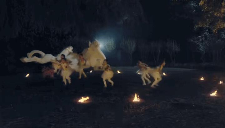 一些奇装异服的 " 妖怪 " 在鱼花塘唱歌跳舞;更诡异的地方甚至突然出现一双长满了毛的手,正对着太阳抚摸时钟,还有一些打扮奇怪的妖怪在唱歌跳舞。