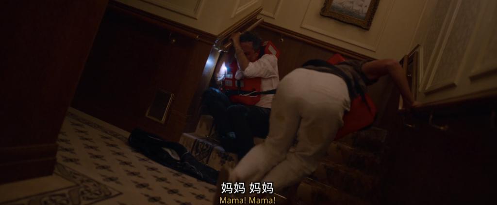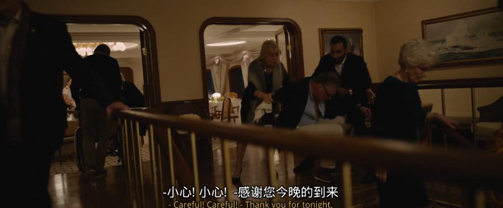 在晚宴上,由于风吹巨浪,游轮被吹的东倒西歪,船体严重倾斜。