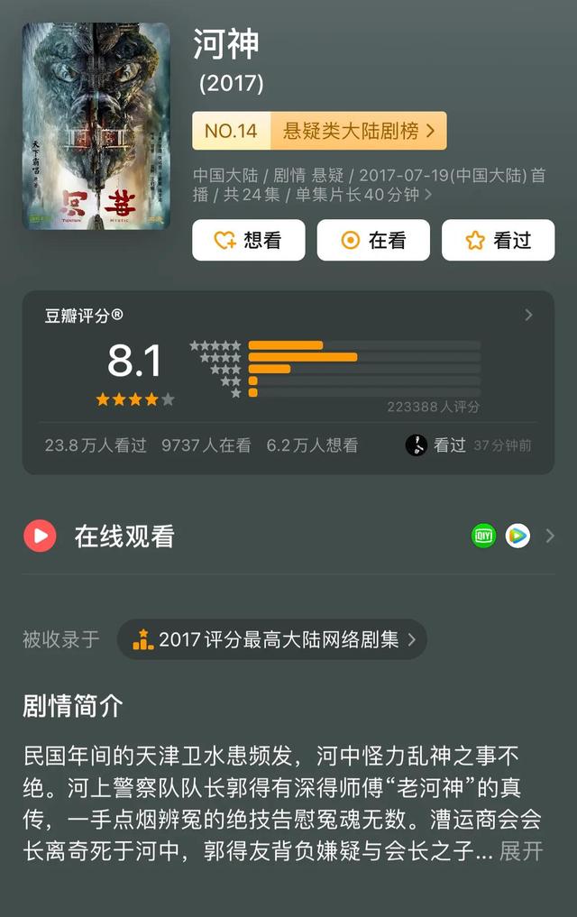 《河神》被豆瓣收录于2017年评分最高大陆网络剧集,也被评为最佳IP网络影视剧。