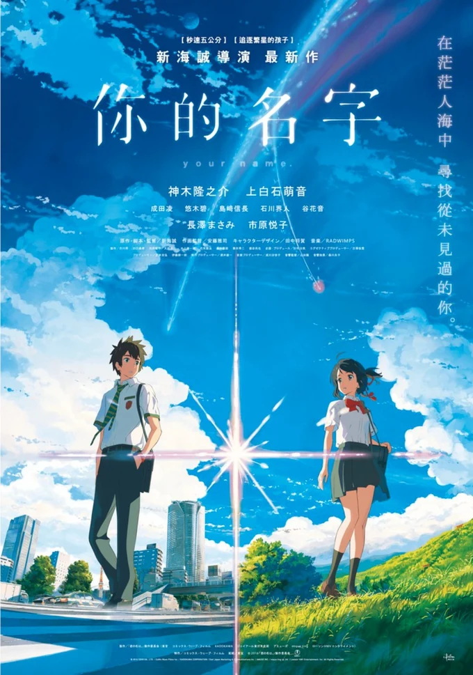 《你的名字》是于2016年8月26日在日本首映的动画电影,也是著名日本作家新海诚编剧与指导,新海诚有着“新世代宫崎骏“之称,虽然他本人表示与宫崎骏齐名实则过誉。