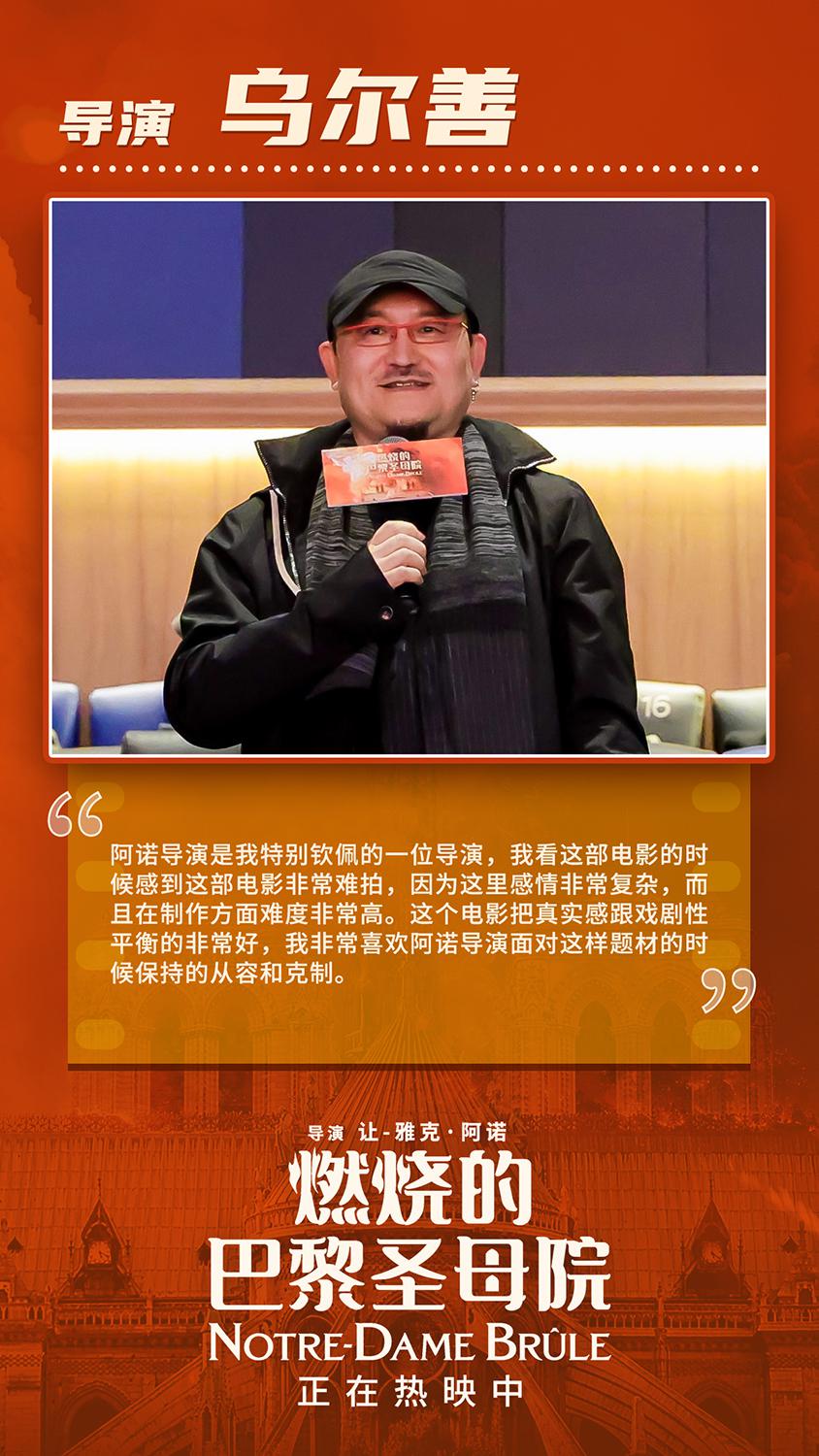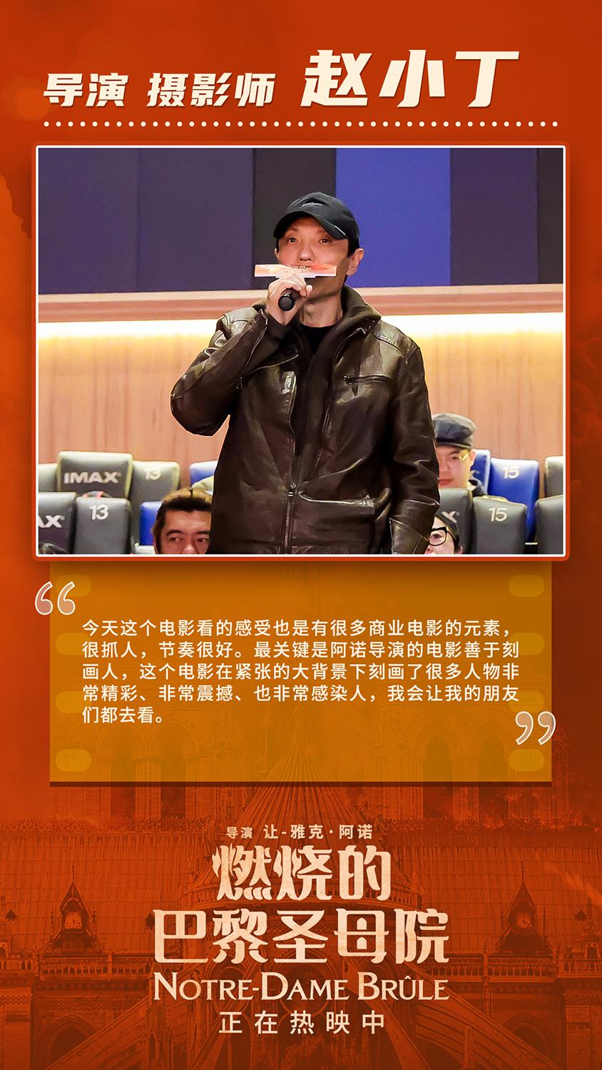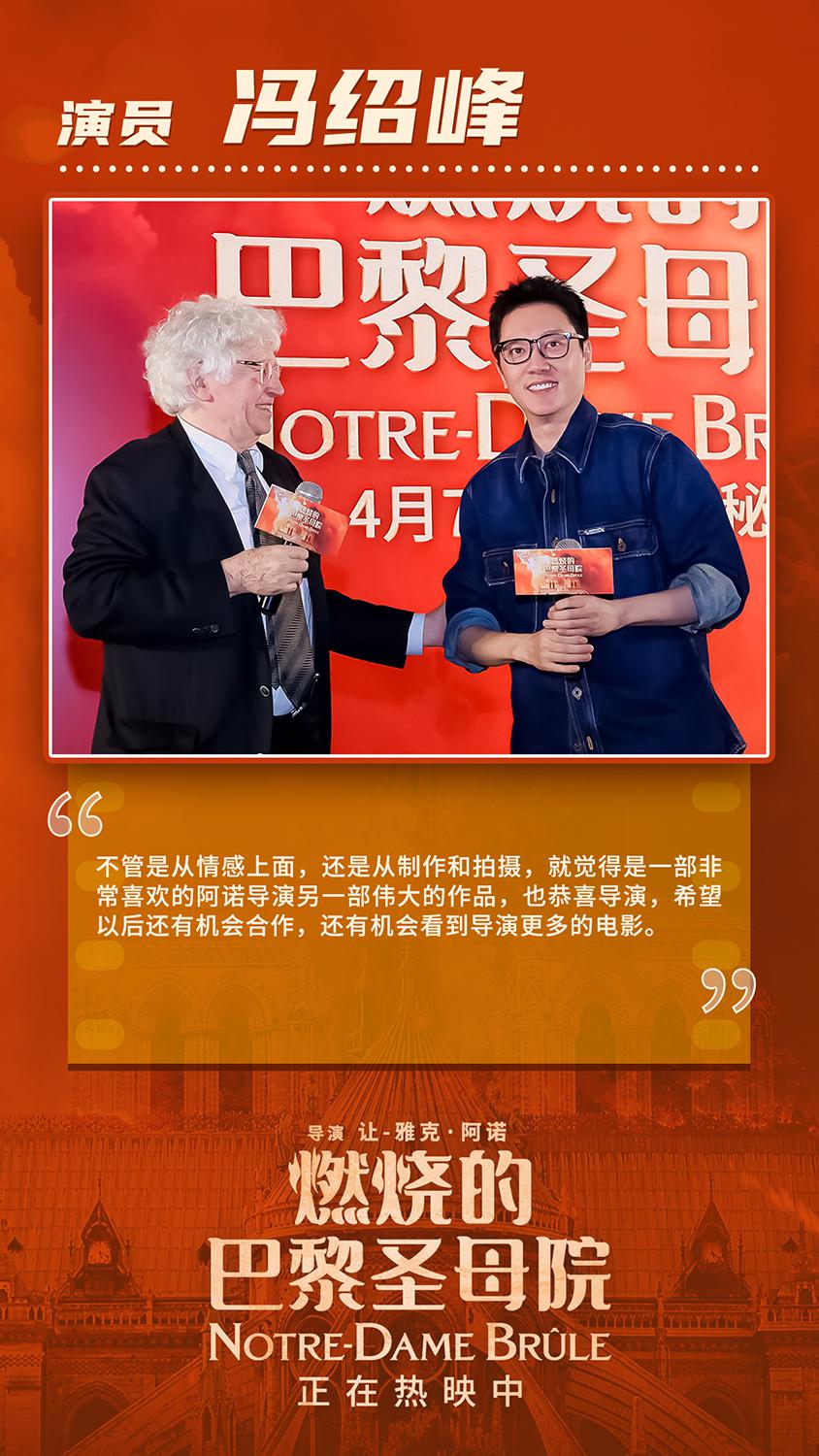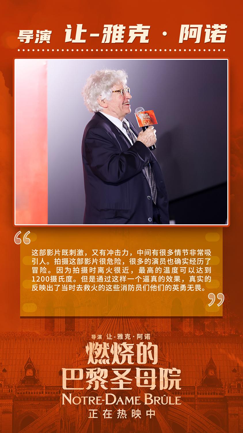 影片导演让 - 雅克 · 阿诺在首映礼现场以特有的法式幽默表达了对中国影迷的祝福,回忆到 8 年前上映的电影《狼图腾》,他表示每次与中国的交流都是美好的回忆,称赞中国拍摄团队是全世界最优秀的团队之一。随后,便分享了影片《燃烧的巴黎圣母院》的创作初衷:无论是儿时的艺术启蒙,还是求学时对中世纪历史的研究,巴黎圣母院对于他都是无可替代的精神符号。对于这样一部高规格、高品质的灾难电影,创作的过程也是困难重重,导演对此回忆说:片场最高温度达 1200 ℃,演员置身其中不能超过 1 分钟,特别是对大火的呈现,尽最大限度选择实拍。尤其擅长国际视野、多元视角创作的让 - 雅克 · 阿诺,这次重新回到法国巴黎、将镜头对准巴黎圣母院这位 " 顶流明星 ",在创作理念上也有了全新升级,在真实事件与作者表达之间寻求到了全新的平衡点。