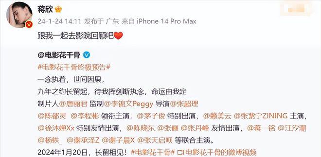 对于观众们对陈都灵版《花千骨》的批评,蒋欣很直白的说:跟我一起去影院回顾吧。力挺之意非常明显。