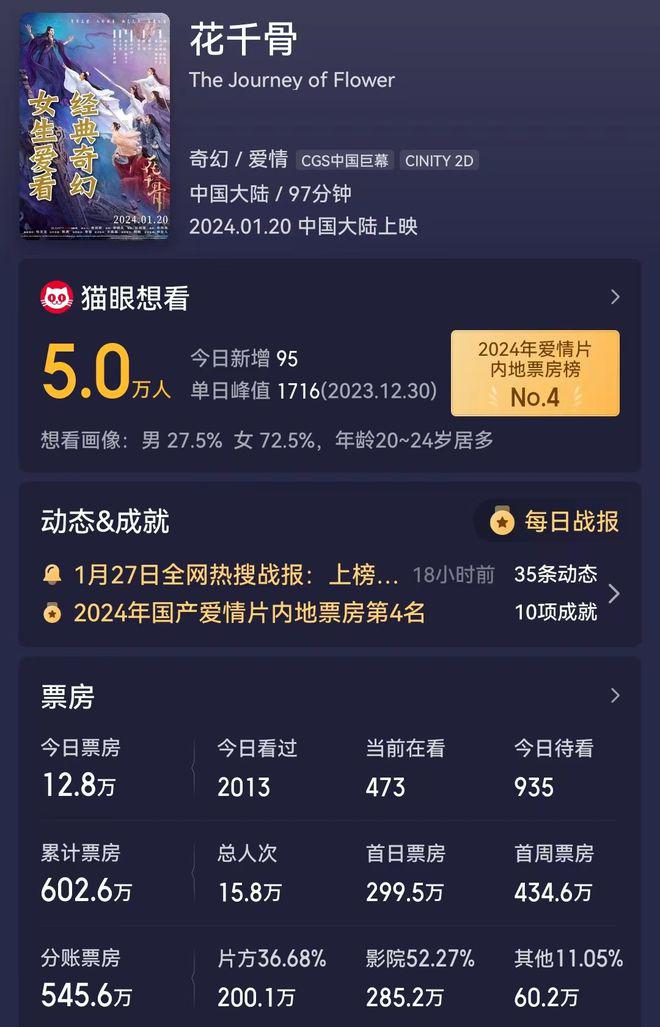 果不其然,陈都灵版《花千骨》的票房可以用扑街来形容,上映 9 天,票房刚过 600 万。