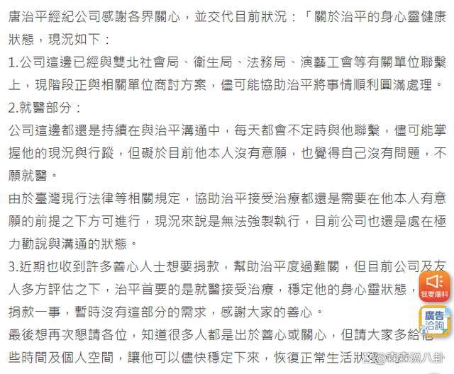 经纪公司透露因为本人没有意愿就医,所以无法强制执行,只能极力劝说和沟通,最近很多人表示要捐款,但首要任务是让他就医接受治疗,暂时没有这部分的需求,也呼吁外界给予空间,让他恢复正常生活。