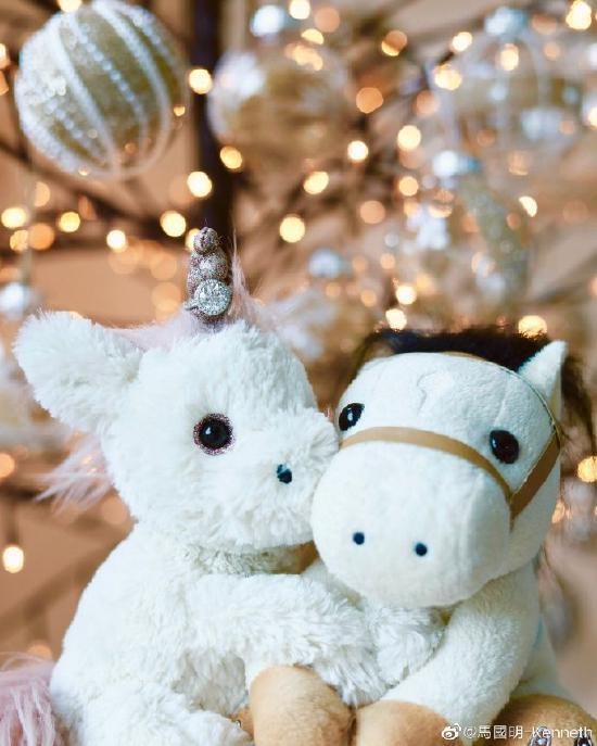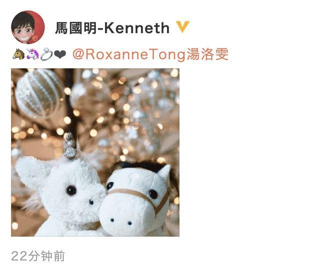 网易娱乐 1 月 1 日报道 1 月 1 日 13:14,马国明微博卡点晒照,照片中两只毛绒玩具上顶着一只钻戒,配文则是四个表情。