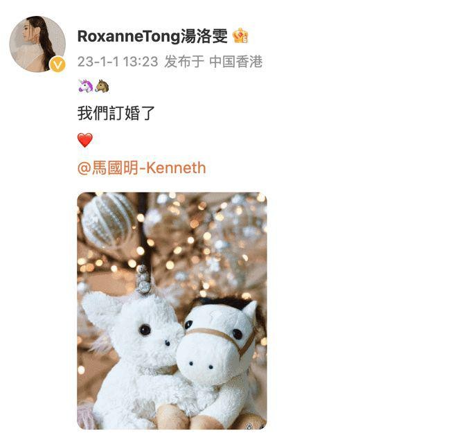 稍晚,汤洛雯也晒出同样的照片揭晓谜底,开心宣布 " 我们订婚了 "。