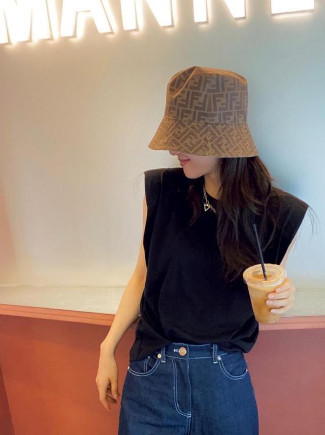 其实像渔夫帽这样的帽子搭配也是增加炫酷风格的好方法,所以大家在佩戴的时候一定要注意各种帽子和首饰的搭配,因为它们也是增加我们佩戴风格的一个非常好的方法。裤子是深蓝色牛仔裤。我们都知道牛仔裤是百搭裤。对于清凉风格的衣服,还是可以穿得恰到好处的。