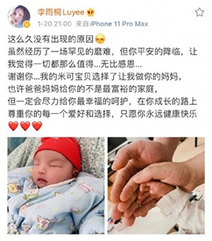 2025年1月20日,李雨桐宣布自己的儿子来到人间。