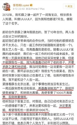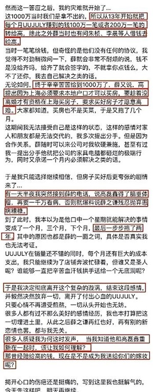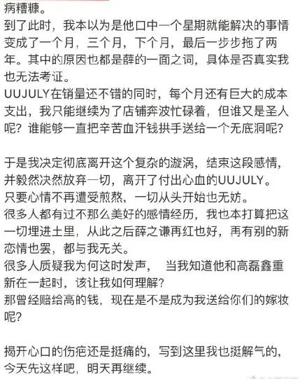 2013年,高磊鑫发的自拍照,穿的衣服是薛之谦自创的潮牌。2015年,两人离婚,薛之谦付出一千万作为安家费。