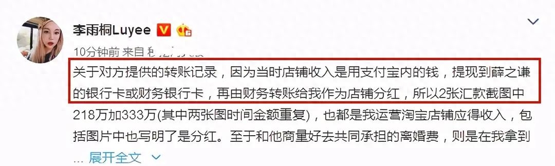 李雨桐却说,转账的钱是店铺的合法收入,在薛之谦离婚案中,她大概承担了300万。买车的钱是用商店收入买的,用于商用。出轨更是无稽之谈。