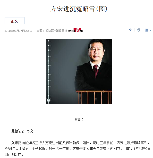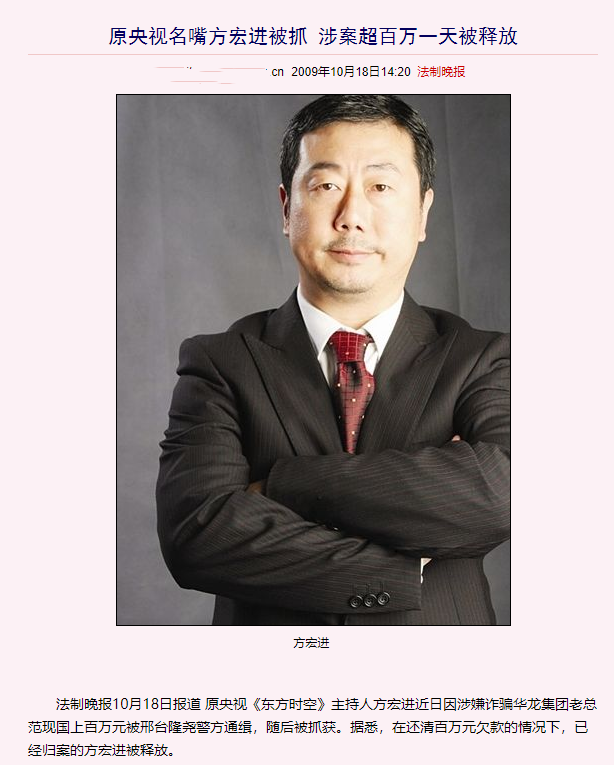 作为知名主持人,方宏进2009年因涉嫌合同诈骗犯罪身陷囹圄。