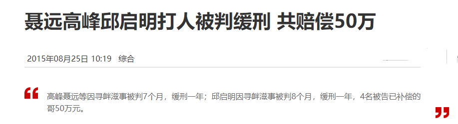 他还是因寻衅滋事,在8月24日被判有期徒刑八个月,缓刑一年。高峰、聂远、何睦则因寻衅滋事罪被判处有期徒刑7个月,缓刑1年。