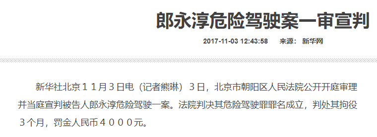 11月3日,郎永淳以危险驾驶罪被判处拘役三个月,罚款4000元。