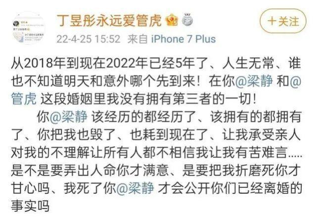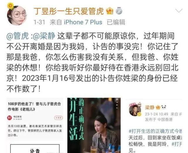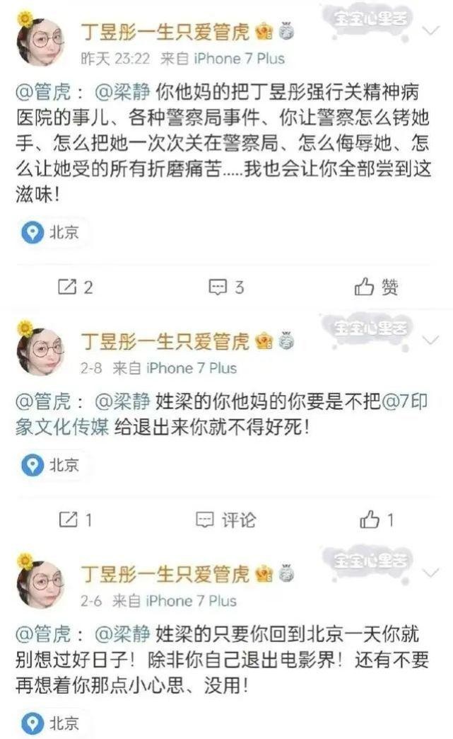 到了2025年,管虎梁静一直没有官宣离婚,为此丁昱彤曾经大闹梁静公司,当时被公司其他工作人员赶出门外。当时气不过的丁昱彤还放话说一定会要梁静付出代价,还艾特了导演费振翔予以感谢。让人疑惑的是,丁昱彤这些看似不正常的微博,竟然还得到了圈内人的点赞,此前丁昱彤公开喊话梁静微博的动态被一位名叫李想的导演公开点赞,不知对方是手滑了,还是想恶心管虎呢?