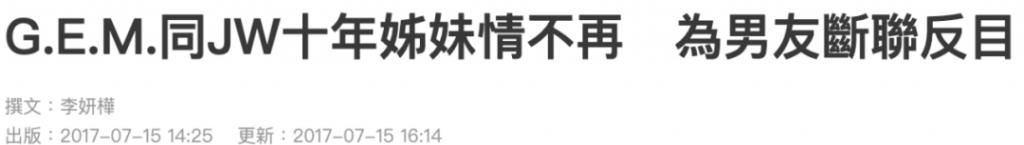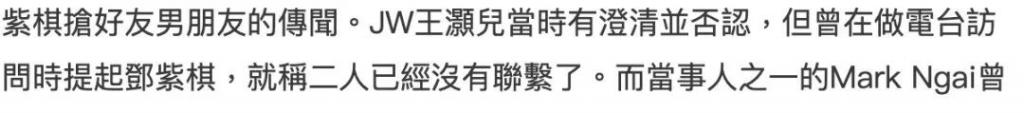 虽然JW始终只表示跟阿Mark是"旧朋友",并不承认是"旧男友",但她跟邓紫棋的友情已逝,却是不折不扣的事实,不怪被媒体写成,"撬墙角,姐妹情不在","为爱断联反目"。