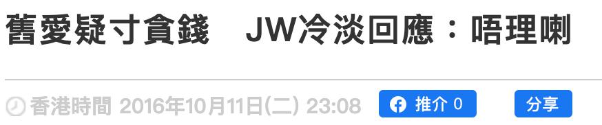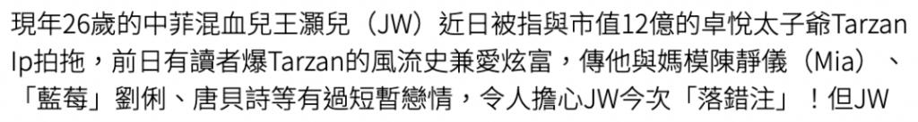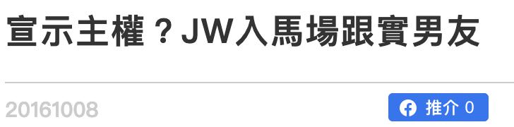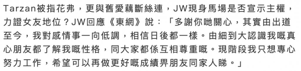 说起来,JW出道十来年,感情绯闻算不上多,但她跟这位曾被称作"卓悦太子爷"的叶韦彤(Tarzan Ip)的恋情,打从2016年曝光起就不被外界看好,甚至为她徒增了"拜金"、"贪财"的注解。