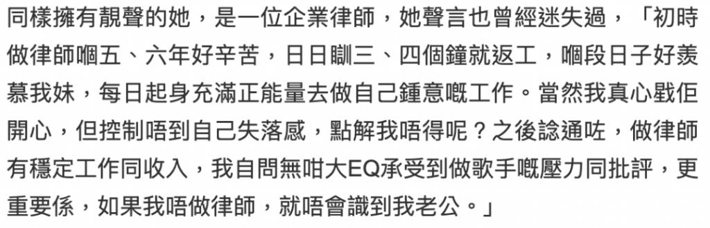 ▲她曾在专访里表达过对妹妹可以做真正喜欢的事情的羡慕,感慨自己每天要上班赶工,真的很辛苦,但是做律师,既有稳定收入,又不用承担当歌手、明星的压力和批评,闲时还能做做KOL,照样接接广告,赚点外快,何乐不为呢。