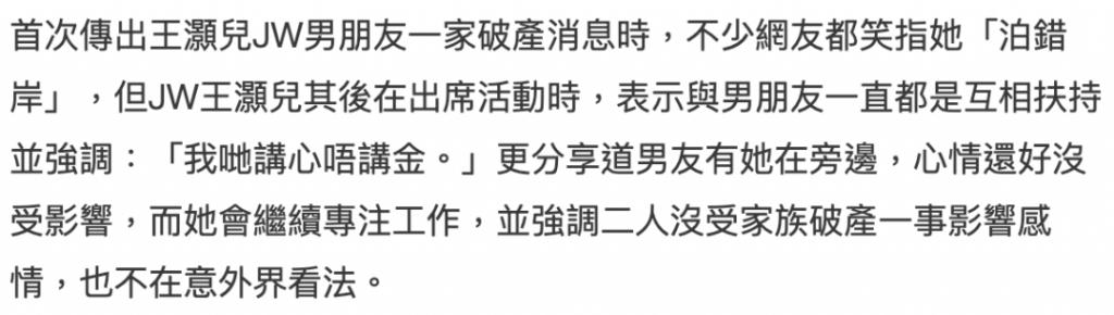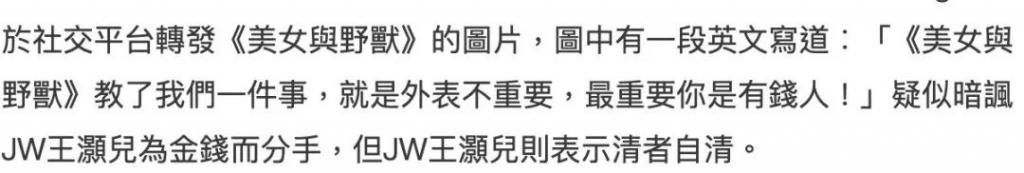 但当时JW还是表现出"情比金坚"的样子,她在面对媒体时强调,"我们多年来一路互相支持,有什么事大家都在身边,不需要多说,行动最实际","我哋讲心唔讲金。"