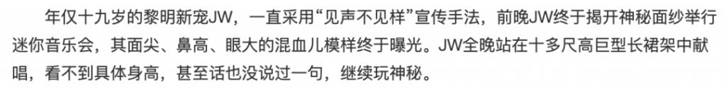 而姐姐Cindy,身材相貌同样出众,且一样热爱歌唱。JW曾说,她学生时代去参加各种歌唱比赛,正是受到了姐姐的启发和影响。