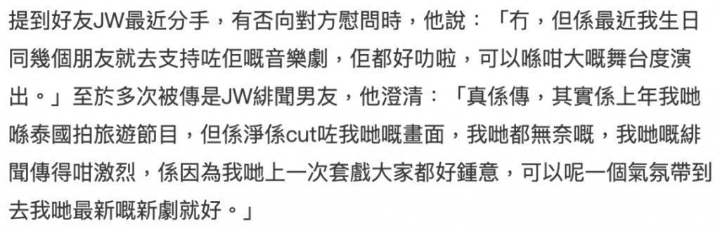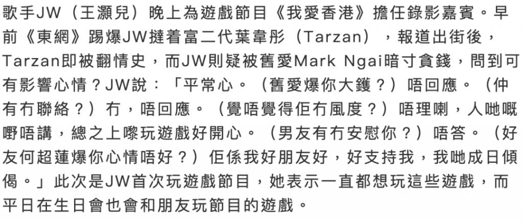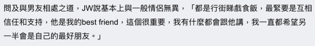 当被记者问到男友听到新歌的反应时,JW笑笑回答,"男友永远是自己的第一个听众,他很喜欢,觉得很sweet",还说不希望因为自己是公众人物的关系,令到男友和他的家人时常见报,备受媒体的关注,所以会尽量"少说话","保护他"。