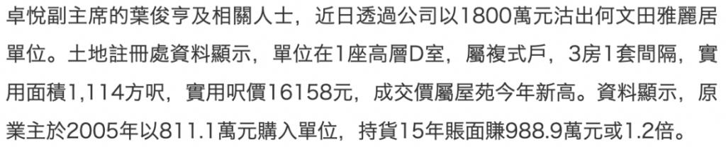 ▲ 接着又在9月,再次以1800万的价格出售了何文田雅丽居的单位,这套较买入价,倒是涨了不少。
