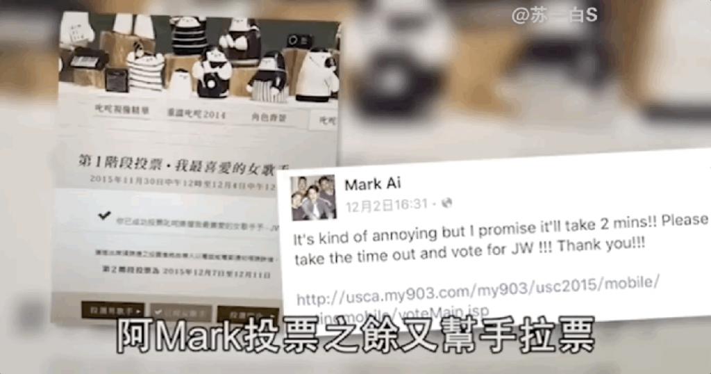 阿Mark自己也上阵,呼吁周围人帮忙为JW投票"最喜爱的女歌手奖":