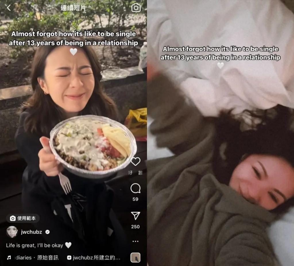 视频里,她配了一个人旅行或者跟朋友聚会的画面,写道,"Almost forgot how it’s like to be single after 13 years of being in a relationship(恋爱了13年,几乎忘了单身是什么感觉)",并表示,"Life is great, I’ll be okay(生活很美好,我会没事的)"。