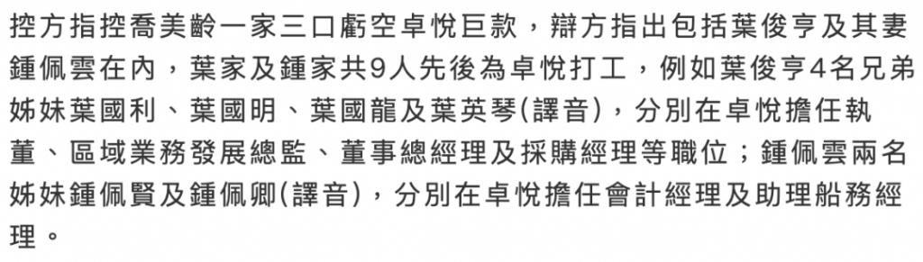 乔美龄还大爆猛料,将自己这些年帮忙叶家提升社会地位的各种努力全盘托出,像是花了150万协助身为马会会员的叶俊亨升级为了全费会员;帮忙卓悦成功赞助了《慈善星辉仁济夜》节目;还帮叶俊亨的女儿邓肇殷跻身了仁济总理之列。